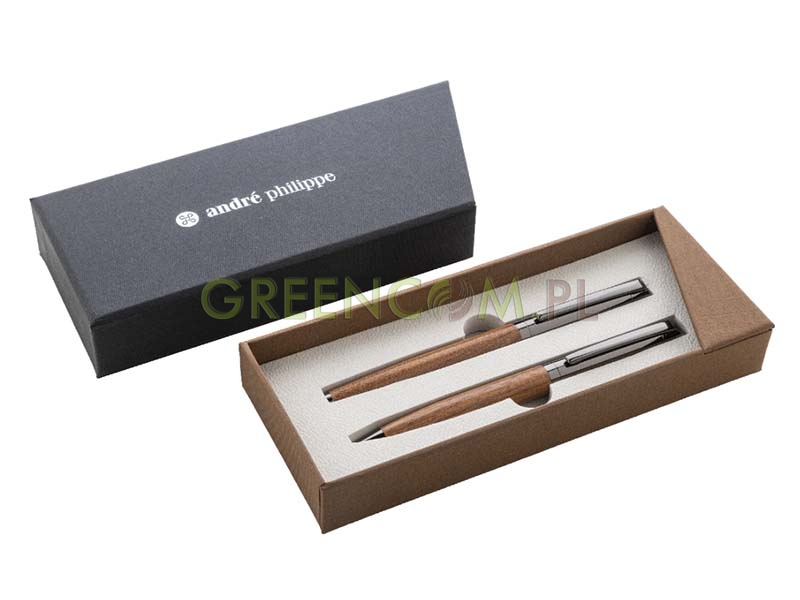 Elegancki, metalowy zestaw składający się z długopisu i pióra kulkowego z drewnianym korpusem i błyszczącymi, metalowymi detalami. W dwukolorowym pudełku prezentowym, z niebieskim wkładem.