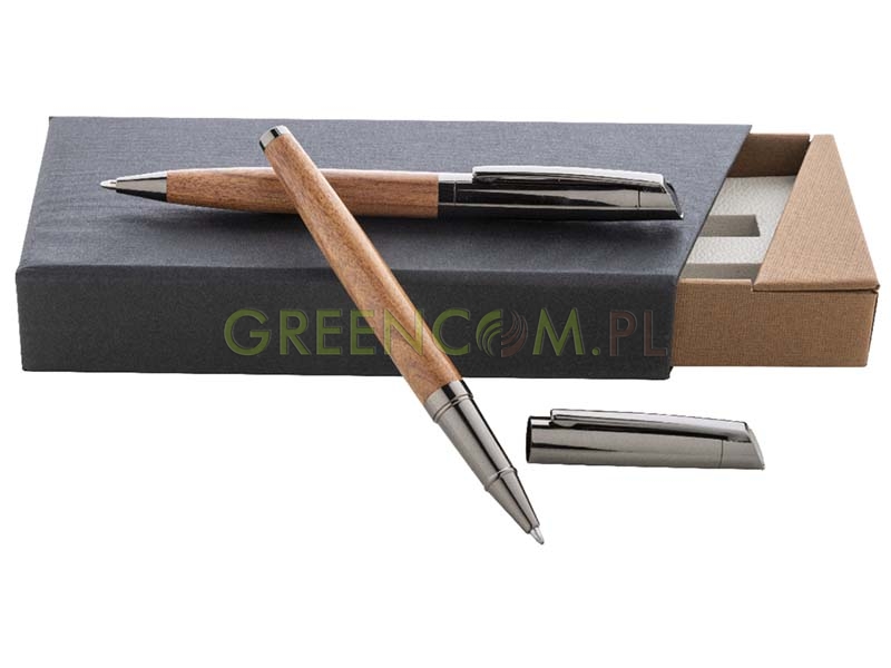 Elegancki, zestaw składający się z długopisu i pióra kulkowego z drewnianym korpusem